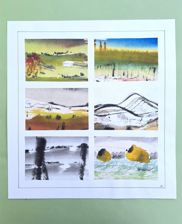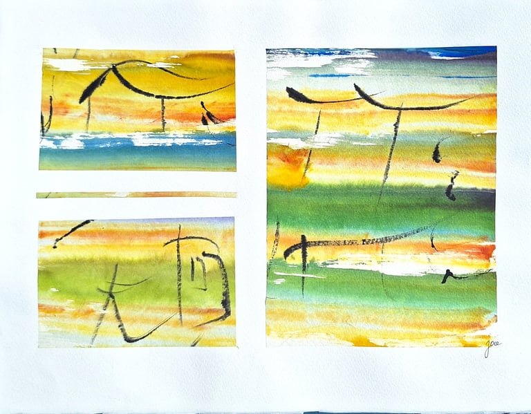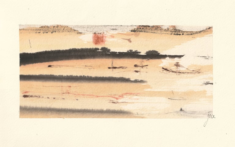 Je peins depuis quelques années des encres sur du papier asiatique avec des pinceaux chinois ou d’autres outils comme des rameaux de bois, des plumes d’oiseaux, des épis floraux voire des éponges. J’utilise de l’encre de Chine, des encres acryliques de couleur et des pigments en poudre. Puis je maroufle sur du Velin d’Arches.