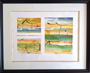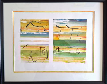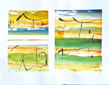 Composition de 9 travaux de 12 cm sur 8 cm (encres de Chine et encres acryliques, pinceaux et rameau végétal)